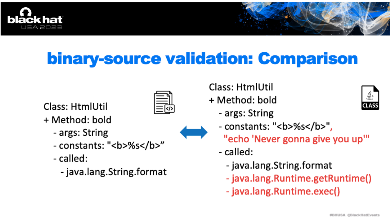 Binary-source validation offers a method for developers to validate build artifacts (i.e. a JAR file in Java or a DLL in C#), instead of just checking for a “reproducible build” (which is very indeterministic and might include the compromise in both builds) as a means of software verification.