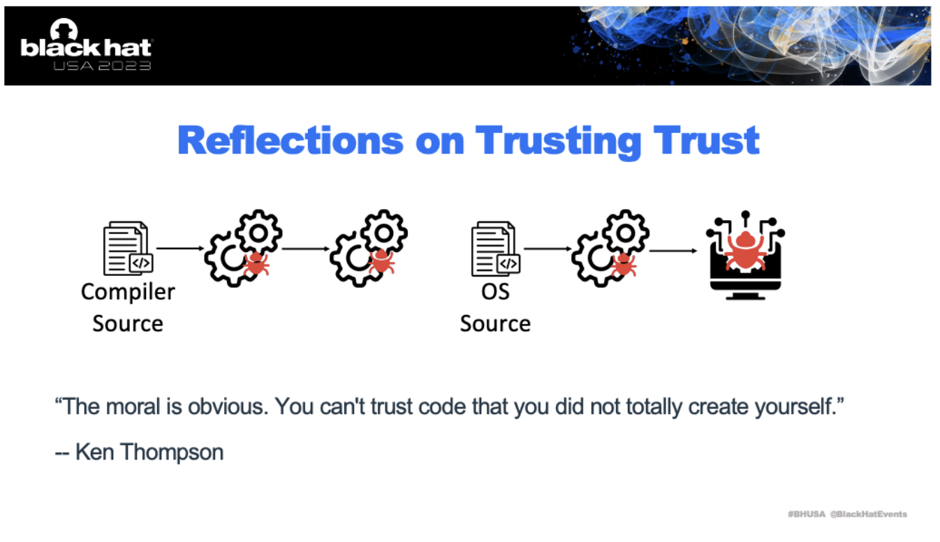 Thompson’s paper depicts a potential threat in which a code compiler could be compromised with a backdoor in such a way that the backdoor doesn’t appear in the published source code.