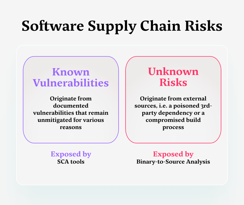 Adding binary-to-source code analysis capabilities to the security stack addresses the risk of unknown vulnerabilities.