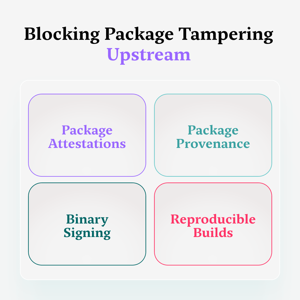 3. Signing The Binary Artifacts allows users to check the file level independently (by verifying the signature) whether a package has been tampered with (see npm’s ECSDA signing procedure here, or SigStore for an example).