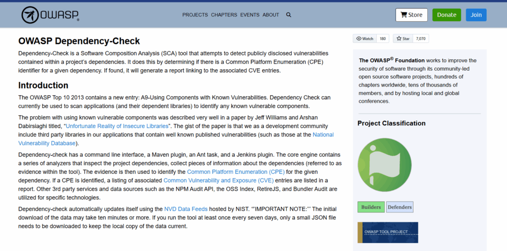 A Java-first SCA tool that scans pom.xml, jar, and war files for known CVEs using multiple data sources. Dependency-Check predates many modern tools but is still widely used in enterprise Java environments. Its results can be exported in XML, HTML, or JSON, and it supports basic policy gating.