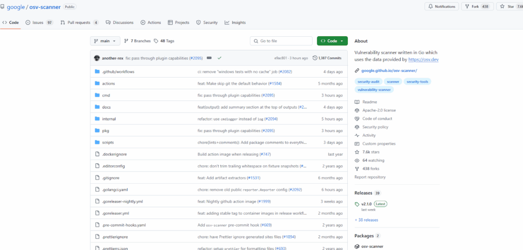 Google’s OSV-Scanner links directly to the Open Source Vulnerability database, offering commit-level precision in detecting known CVEs across modern ecosystems like npm, Go, and PyPI.